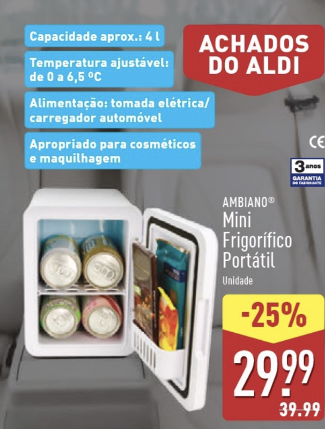 O Aldi vai colocar à venda em Portugal um mini frigorífico portátil da marca Ambiano. O equipamento, com capacidade aproximada de quatro litros, permite manter bebidas e alimentos a temperaturas reguláveis entre 0 e 6,5 graus Celsius. Compacto e portátil, adapta-se a diferentes contextos, como viagens e deslocações, bem como a espaços reduzidos, incluindo escritórios e caravanas.