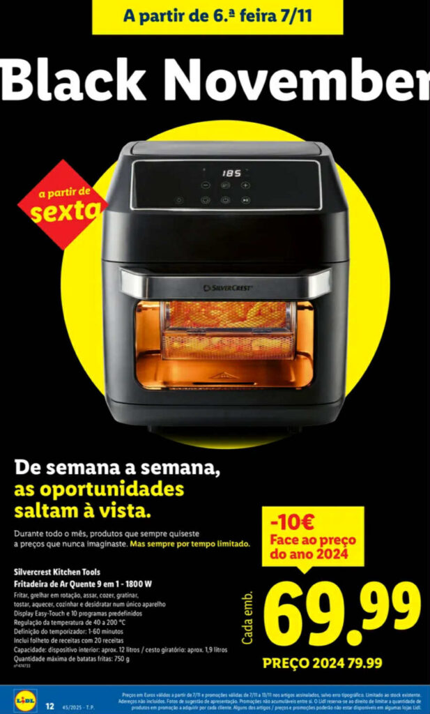 Em destaque no folheto em vigor, a fritadeira de ar quente 9 em 1 da SilverCrest Kitchen Tools (1800 W) encontra-se à venda desde 7 de novembro por 69,99 euros, com referência a uma descida de 10 euros face ao preço indicado em 2024 (79,99 euros). A oferta integra a campanha Black November e mantém-se apenas durante o período do folheto, limitada ao stock existente.