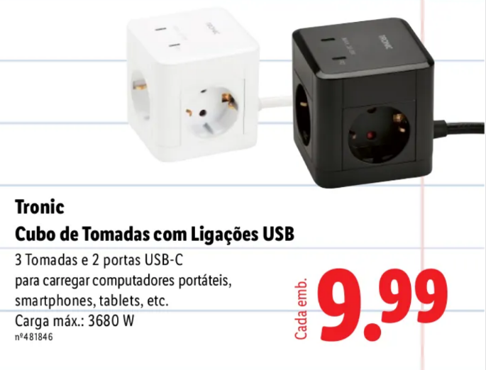 O Cubo de Tomadas com Ligações USB, disponível no Lidl em folheto a partir de sexta-feira, dia 12 de setembro, é um acessório elétrico concebido para facilitar a ligação de vários dispositivos ao mesmo tempo. Trata-se de um equipamento que integra 3 tomadas convencionais e ainda 2 portas USB-C, o que permite carregar computadores portáteis, smartphones, tablets e outros aparelhos compatíveis sem necessidade de múltiplos carregadores.