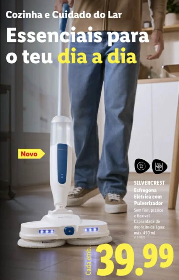 A partir de sexta-feira, 20 de fevereiro, o Lidl vai colocar à venda a Esfregona Elétrica com Pulverizador da marca Silvercrest, um equipamento sem fios pensado para a limpeza de pavimentos no dia a dia. O produto surge na área de “Cozinha e Cuidado do Lar” e é anunciado por 39,99 euros.