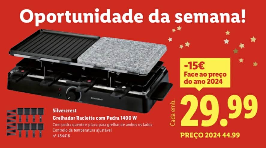 O Lidl vai ter em destaque, a partir de 22 de dezembro, uma promoção para o grelhador raclette com pedra da SilverCrest, com potência anunciada de 1400 W e preço de 29,99 euros. A informação surge num destaque de campanha identificado como “Oportunidade da semana”, onde o artigo aparece descrito como “Grelhador Raclette com Pedra 1400 W”.