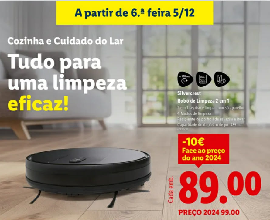O Lidl volta a colocar em destaque o robô de limpeza 2 em 1 da marca própria Silvercrest, integrado na campanha “Cozinha e Cuidado do Lar”. De acordo com o folheto promocional da cadeia de supermercados, o equipamento chega às lojas a partir de 5 de dezembro com um preço de 89 euros, menos 10 euros do que o valor de referência indicado para 2024, que era de 99 euros. A proposta pretende responder à procura crescente por soluções automáticas de limpeza diária, sobretudo em casas onde o tempo disponível é limitado.