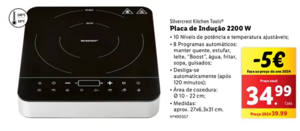 A placa de indução Silvercrest será disponibilizada em unidades limitadas, sem reserva online, com venda direta nas lojas físicas do Lidl a partir de 18 de abril.